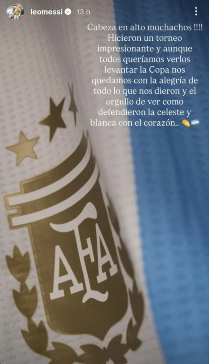 El que siguió de cerca el partido fue Lionel Messi, quien terminado el encuentro le dedicó un mensaje especial al equipo. "¡Cabeza en alto, muchachos! Hicieron un torneo impresionante y, aunque todos queríamos verlos levantar la Copa, nos quedamos con la alegría de todo lo que nos dieron y el orgullo de ver cómo defendieron la celeste y blanca con el corazón", escribió el capitán argentino en sus historias de Instagram.