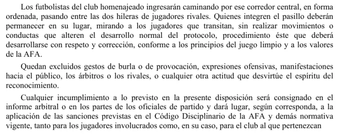 Allí, en el quinto párrafo del documento, dice: "Los futbolistas del club homenajeado ingresarán caminando por ese corredor central, en forma ordenada, pasando entre las dos hileras de jugadores rivales. Quienes integren el pasillo deberán permanecer en su lugar, mirando a los jugadores que transitan, sin realizar movimientos o conductas que alteren el desarrollo normal del protocolo, procedimiento éste que deberá desarrollarse con respeto y corrección, conforme a los principios del juego limpio y a los valores de la AFA".