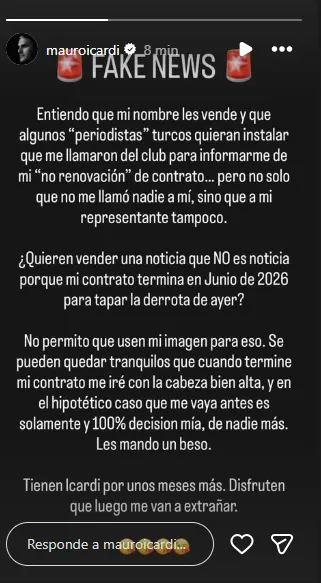 Ante la viralización del tema, Mauro Icardi escribió un descargo para negar estas versiones y escribió: "Entiendo que mi nombre les vende y que algunos "periodistas" turcos quieran instalar que me llamaron del club para informarme de mi "no renovación" de contrato", introdujo el futbolista.