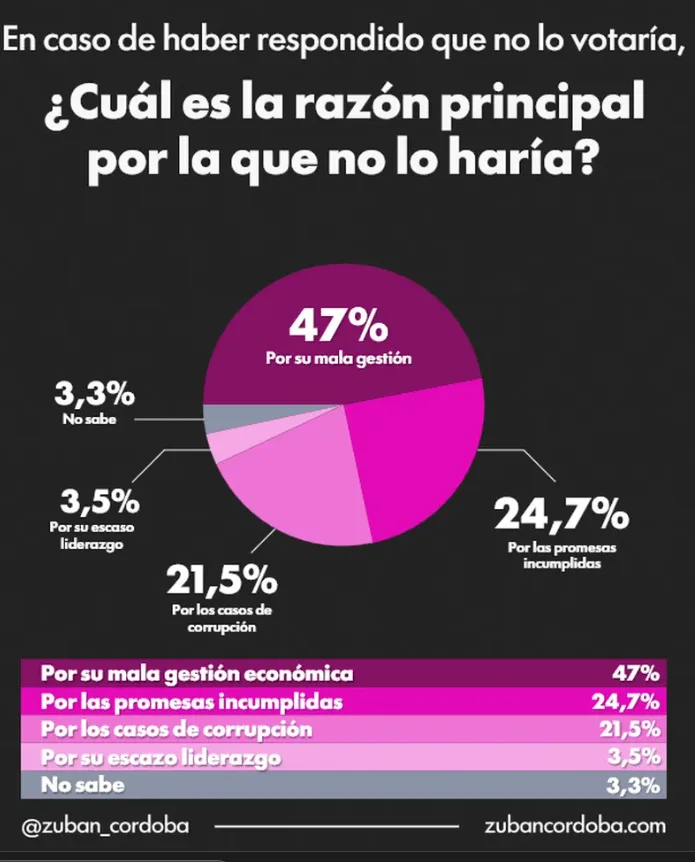 La economía aparece como el principal factor de desgaste: un 47% de los encuestados señala la mala administración económica como motivo central de su rechazo. La inflación, la pobreza y la incertidumbre laboral continúan siendo ejes de preocupación, pese a las promesas de reformas estructurales.