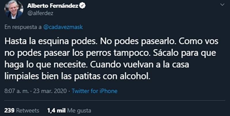 Durante una nueva sesión de preguntas y respuestas en Twitter, el presidente de la Nación, Alberto Fernández, respondió: "Hasta la esquina podes. No podes pasearlo. Como vos no podes pasear los perros tampoco. Sácalo para que haga lo que necesite. Cuando vuelvan a la casa limpiales bien las patitas con alcohol".