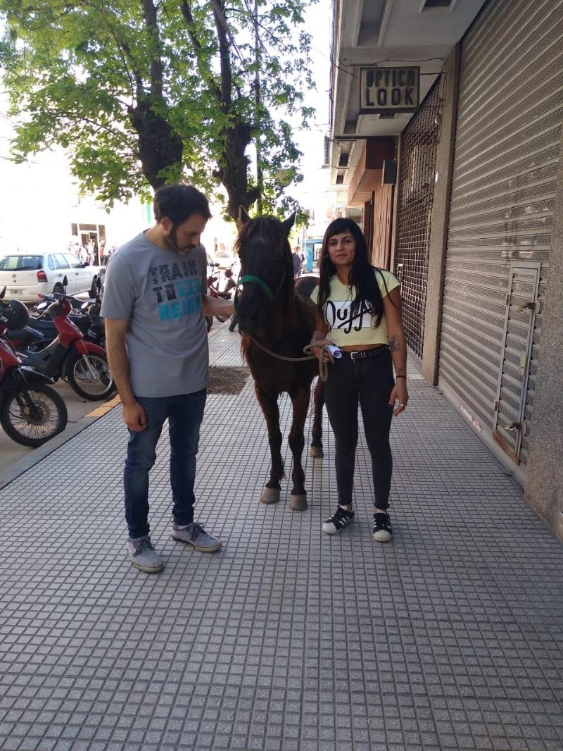 El animal fue rescatado de la Tracción a Sangre. Era sometido a constantes latigazos por parte de su carrero hasta que la yegua se soltó, salió corriendo asustada y produjo un incidente vial en la intersección de las calles Brown e Independencia, en pleno centro zarateño.