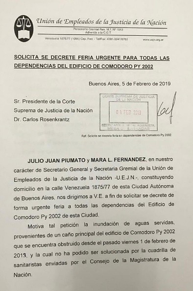 La Unión de Empleados de la Justicia de la Nación pide extender la feria judicial porque Comodoro Py "es un foco infeccioso para la proliferación de enfermedades". Así se lo solicitaron al Presidente de la Corte Suprema, Carlos Rosenkrantz.