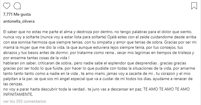 "El saber que no estás me parte el alma y destroza por dentro. No tengo palabras para el dolor que siento, nunca voy a soltarte (nunca voy a estar lista para soltarte)", manifestó la joven bailarina.