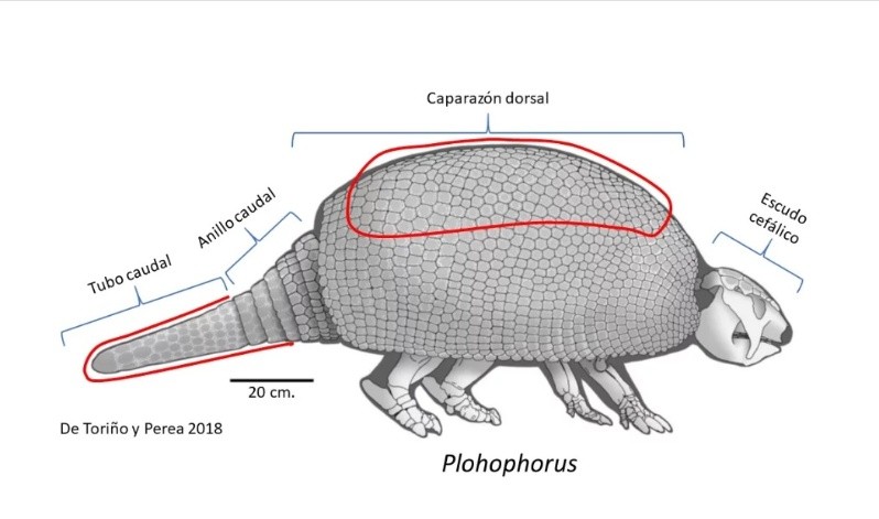 Esta estructura ósea masiva que recubría la cola de los gliptodontes les permitía defenderse de predadores y seguramente eran utilizados en los machos como arma de combate por la posesión de las hembras. El tubo caudal de Plohophorus tiene una gran belleza escultural dada por su particular ornamentación de figuras circulares grandes rodeadas de hileras de figuras circulares más pequeñas generando un patrón, es el arte de la naturaleza.
