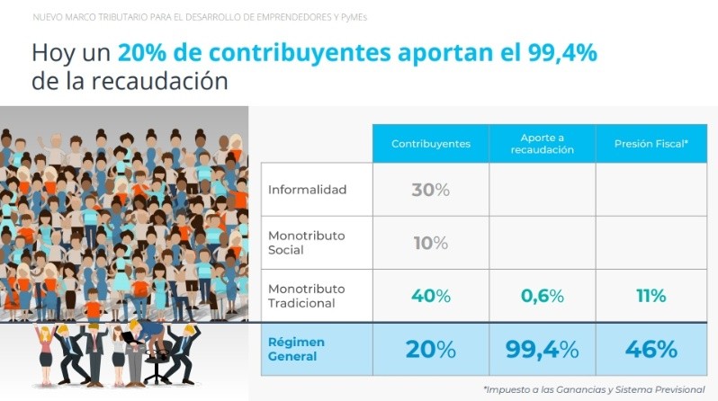 Se trata de un documento titulado "Leyes para la transformación productiva" y en el capítulo dedicado al Nuevo Marco tributario para el desarrollo de Emprendedores y Pymes, en la página siete, incluye una ilustración que grafica que "hoy un 20 por ciento aportan el 99,4 por ciento de la recaudación".