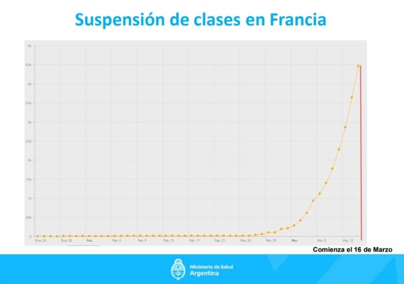 En nuestro territorio hay, por ahora, 56 casos confirmados y dos muertos. Por poner sólo algunos ejemplos para contrastar: en Francia, las clases se suspenden desde hoy, con 4500 infectados reportados y 127 muertos; en Italia, se suspendieron cuando tenían 4000 infectados y unos 100 muertos y en España se suspendieron cuando tenían 3000 casos confirmados. Lo que se ve, en esos tres casos, es que la decisión aparece cuando la curva de crecimiento ya se "descontroló", de manera que es esperable que al menos por un tiempo siga creciendo exponencialmente. Es lo que muestran los gráficos.