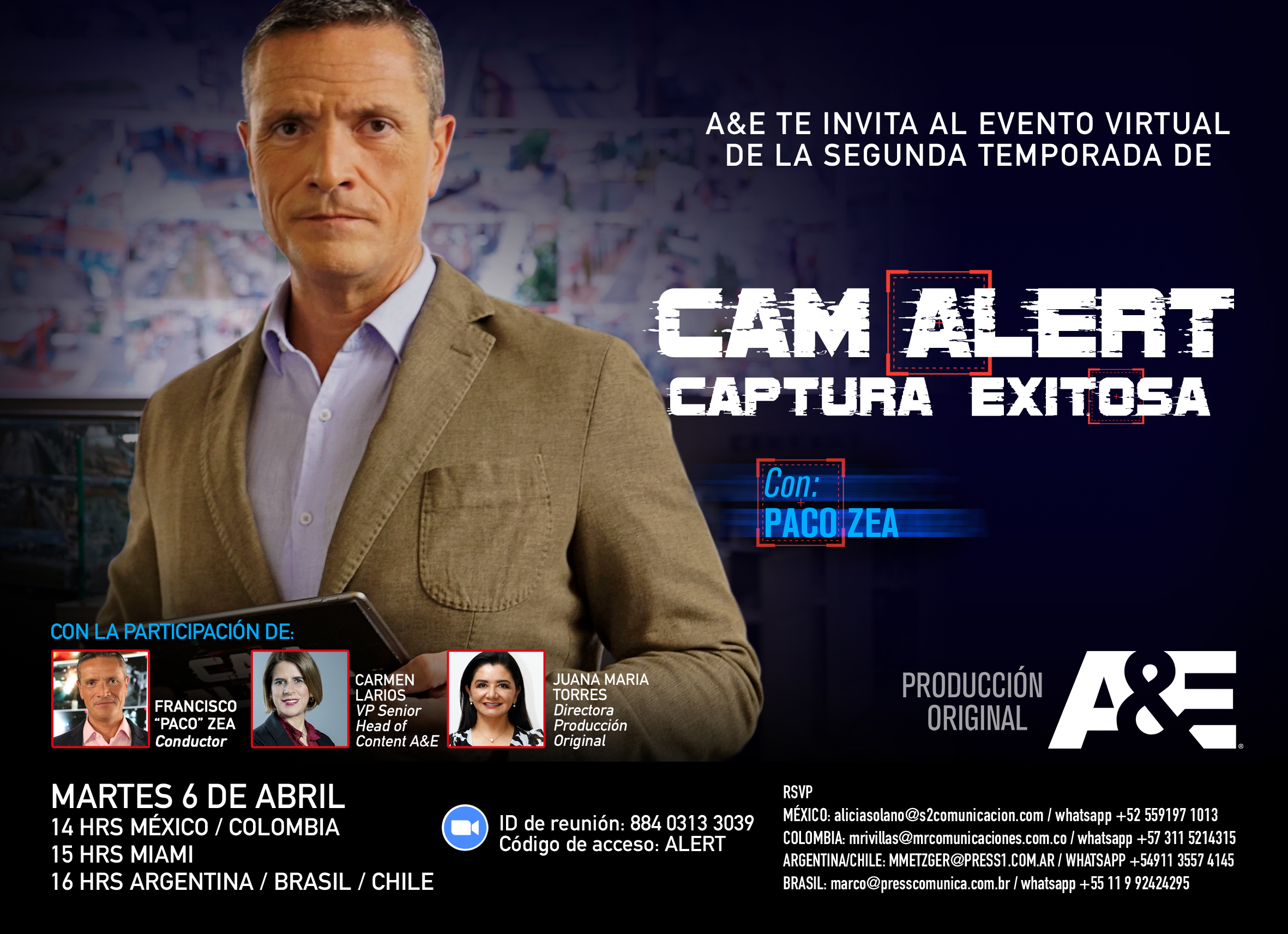 A&E estrena la nueva temporada de CAM ALERT: CAPTURA EXITOSA, que de la mano del presentador 'Paco' Zea, brinda un acceso único y de primera mano a los distintos crímenes, delitos y hechos que registran las cámaras del Centro de Control, Comando, Cómputo y Calidad en México, conocido como el C5, donde se refleja cómo la tecnología de alto nivel y el monitoreo son la mancuerna perfecta de las fuerzas de seguridad del país para capturar espectaculares delitos y así lograr combatir el crimen.