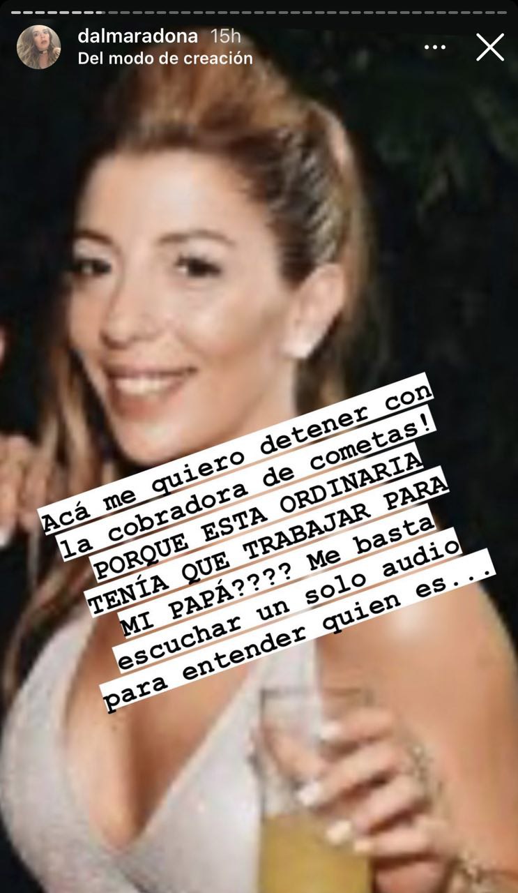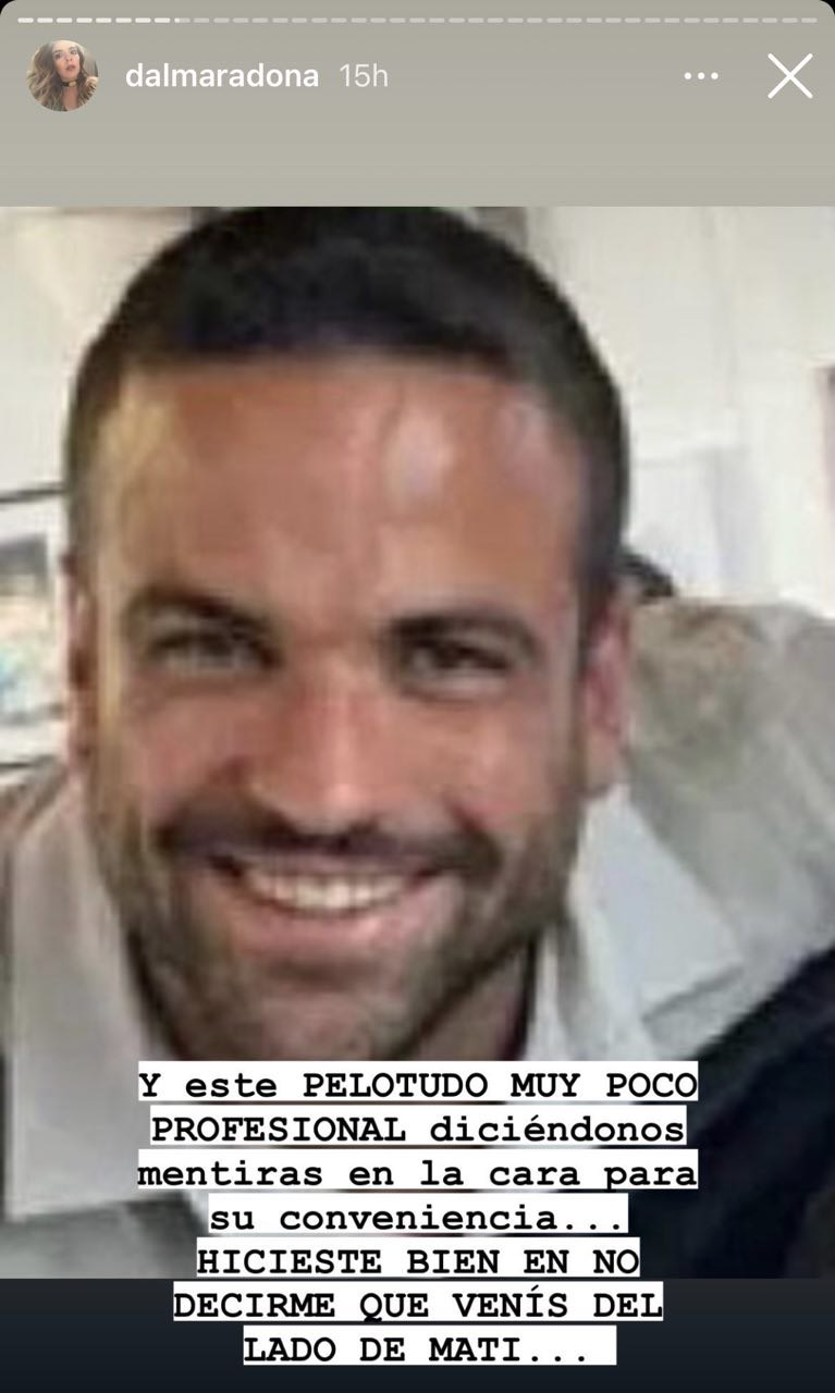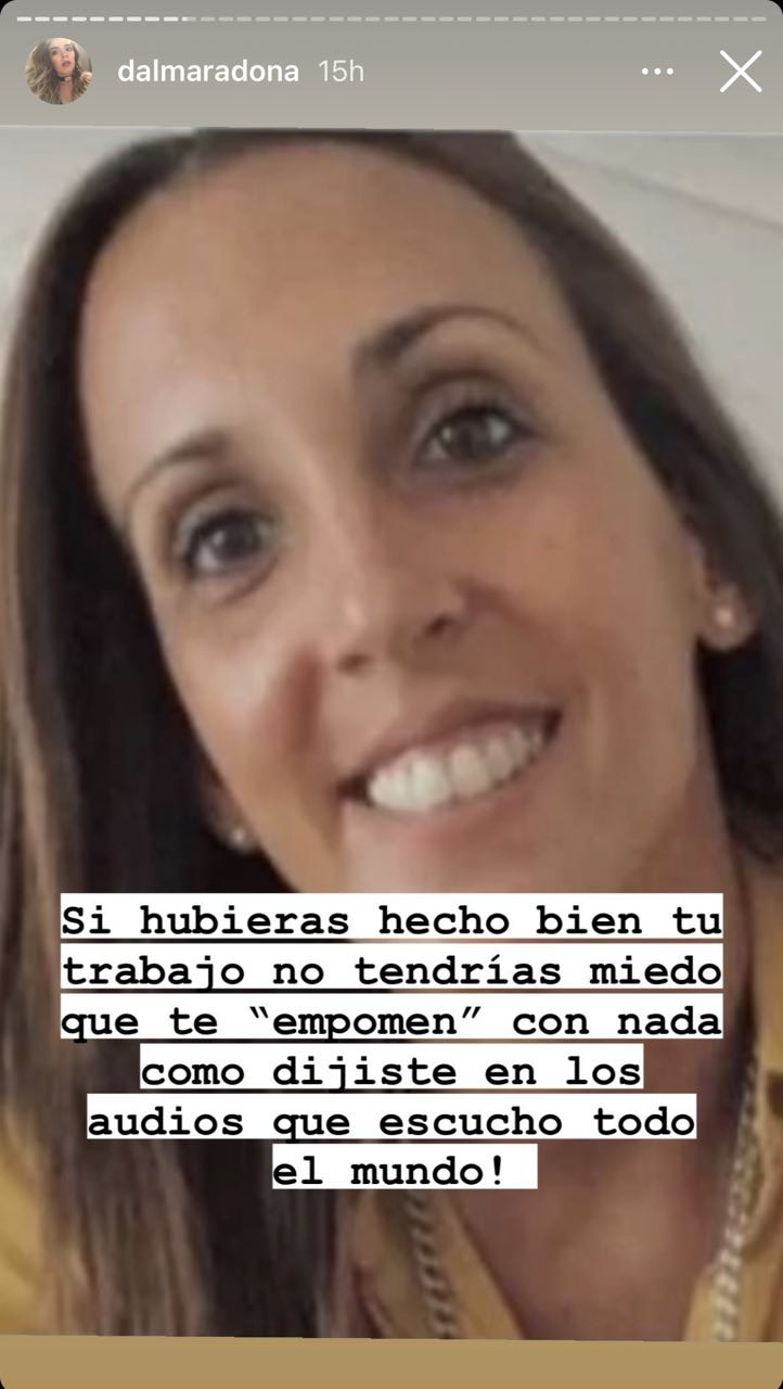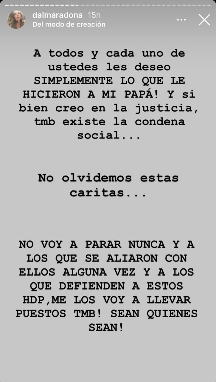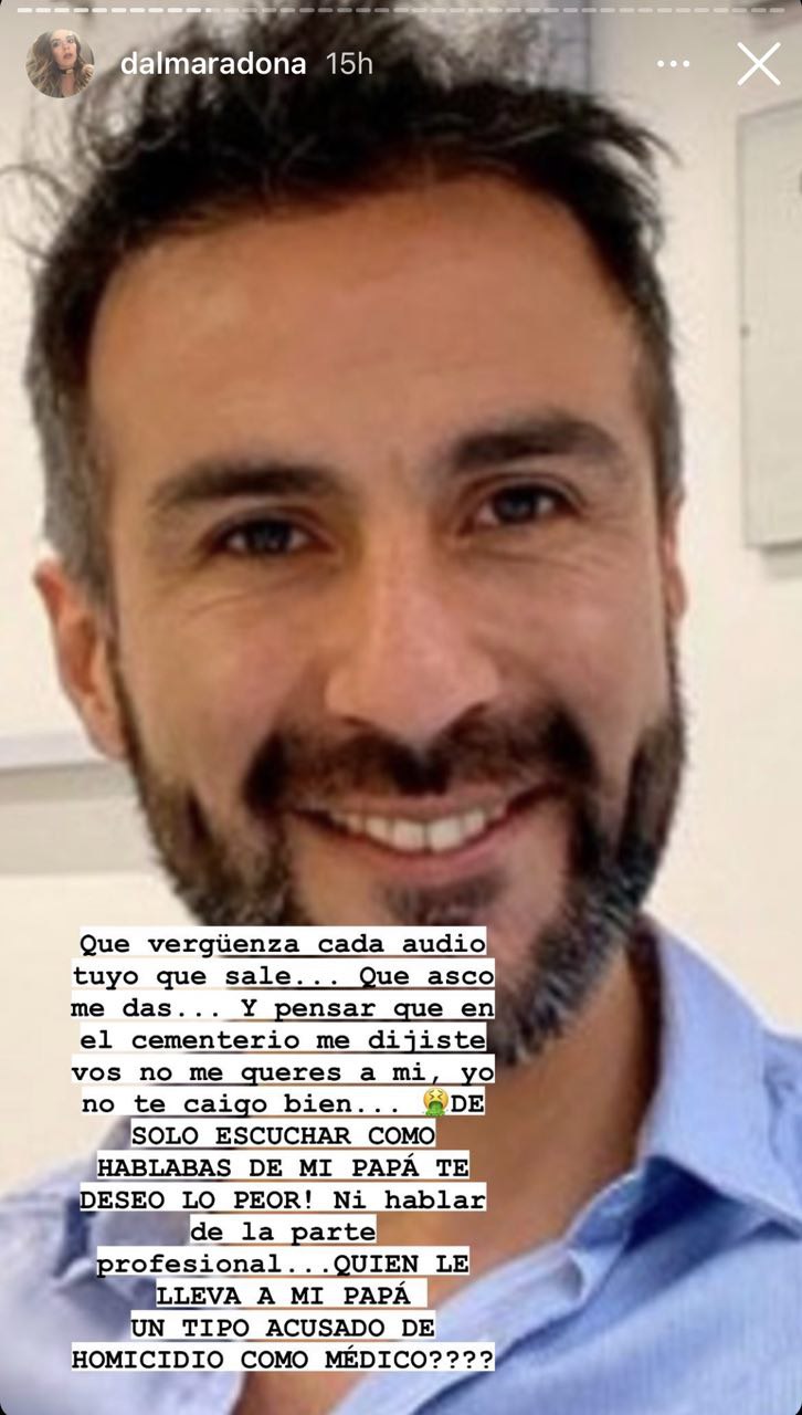 En esta oportunidad, y a horas de que se inicie el 10M, Dalma publicó las fotos de las cinco personas que más influencia tuvieron en la salud de Diego Maradona en los últimos años y le dedicó un mensaje explosivo a cada uno de ellos: el mencionado Morla, Leopoldo Luque (neurocirujano), Agustina Cosachov (psiquiatra), Carlos Díaz (psicólogo) y Vanesa Morla (hermana de Matías y quien manejaba el dinero).