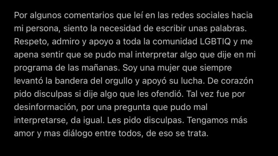 “Por algunos comentarios que leí en las redes sociales hacia mi persona, siento la necesidad de escribir unas palabras. Respeto, admiro y apoyo a toda la comunidad LGBTIQ y me apena sentir que se pudo malinterpretar algo que dije en mi programa de las mañanas”, explicó.