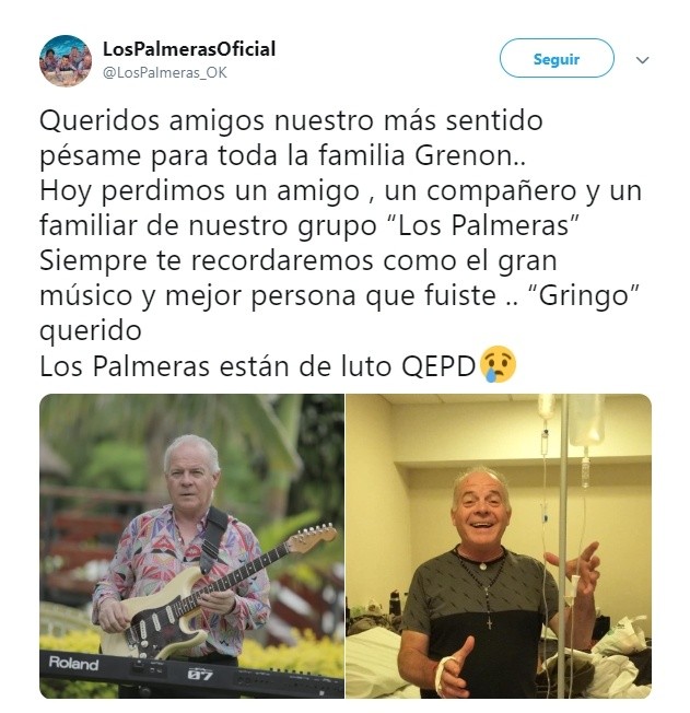 Se trata de Jorge Omar Grenón, guitarrista y tecladista de la reconocida banda santafesina: "Queridos amigos nuestro más sentido pésame para toda la familia Grenon. Hoy perdimos un amigo, un compañero y un familiar de nuestro grupo 'Los Palmeras'. Siempre te recordaremos como el gran músico y mejor persona que fuiste".