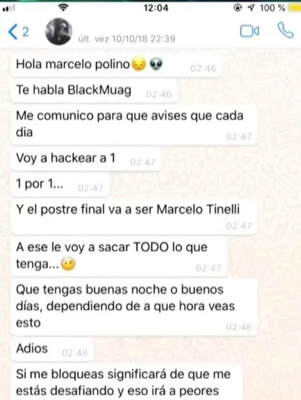 “Hola, Marcelo Polino. Te habla BlackMuag. Me comunico para que avises que cada día voy a hackear a uno por uno, y que el postre final va a ser Marcelo Tinelli. A ese le voy a sacar todo lo que tenga. Si me bloqueás significará que me desafiás, y esto irá a peores”.