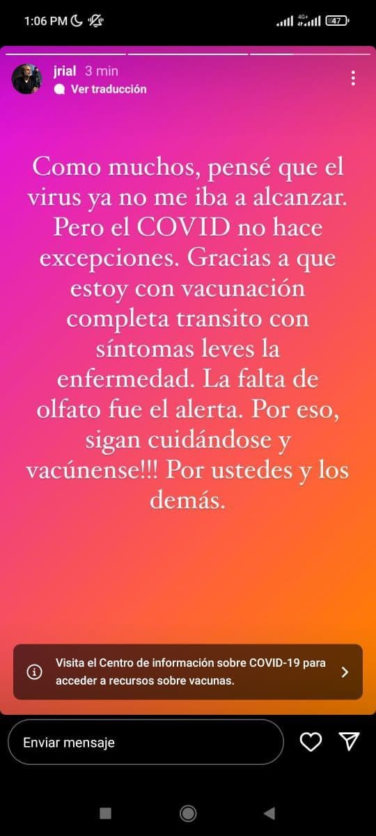 “Como muchos, pensé que el virus ya no me iba a alcanzar. Pero el COVID no hace excepciones”, comenzó escribiendo en una story de Instagram. Y cerró: “Gracias a que estoy con vacunación completa, transito con síntomas leves la enfermedad. La falta de olfato fue el alerta. Por eso, sigan cuidándose, ¡y vacúnense! Por ustedes y los demás!”.
