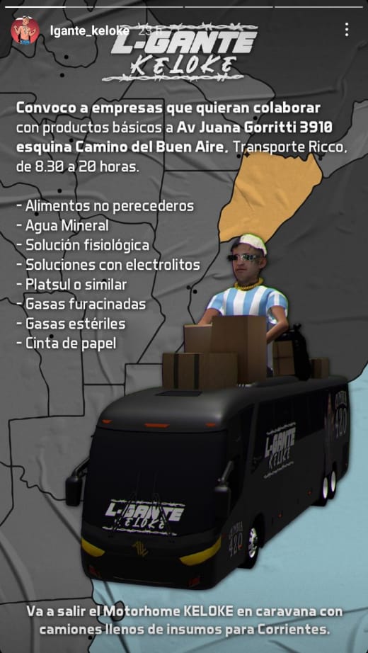 El cantante de cumbia Elián Valenzuela, más conocido como L-Gante, convocó este miércoles a que empresas a colaborar con productos básicos como alimentos no perecederos, agua mineral y medicinas que serán transportados en caravana desde Buenos Aires hasta Corrientes en el motorhome del cumbiero.