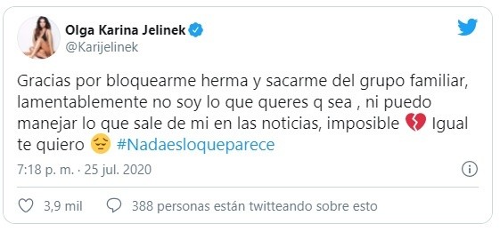 "Gracias por bloquearme, herma, y sacarme del grupo familiar. Lamentablemente no soy lo que querés que sea, ni puedo manejar lo que sale de mí en las noticias, imposible", escribió Karina en Twitter, mostrando su angustia.