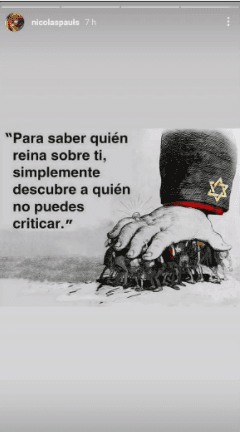 La situación se tornó candente, cuando el actor compartió una frase del pensador francés Voltaire acompañada de una imagen polémica. “Para saber quién reina sobre ti, simplemente descubre a quién no puedes criticar”, decía la desacertada frase acompañada por una ilustración en la que se ve una mano grande oprimiendo a un grupo de personas. En la manga que cubre el brazo, se ve la Estrella de David, símbolo representativo del judaísmo.