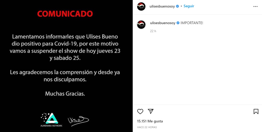 "Lamentamos informarle que Ulises Bueno dio positivo para Covid-19, por este motivo vamos a suspender el show de hoy jueves y sábado 25. Les agradecemos la comprensión y desde ya nos disculpamos", reporta un comuicado que compartió a través de sus redes sociales.