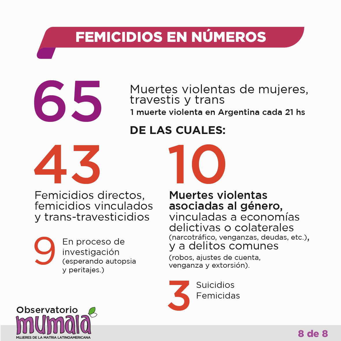 A través de su reporte, desde MuMalá indicaron que desde el comienzo del año hasta el último 27 de febrero, se produjeron 65 muertes violentas de mujeres, travestis y trans; 43 en el marco de violencia de género; 10 vinculadas a economías delictivas; 9 por causas que aún están en investigación y 3 por suicidios femicidas.