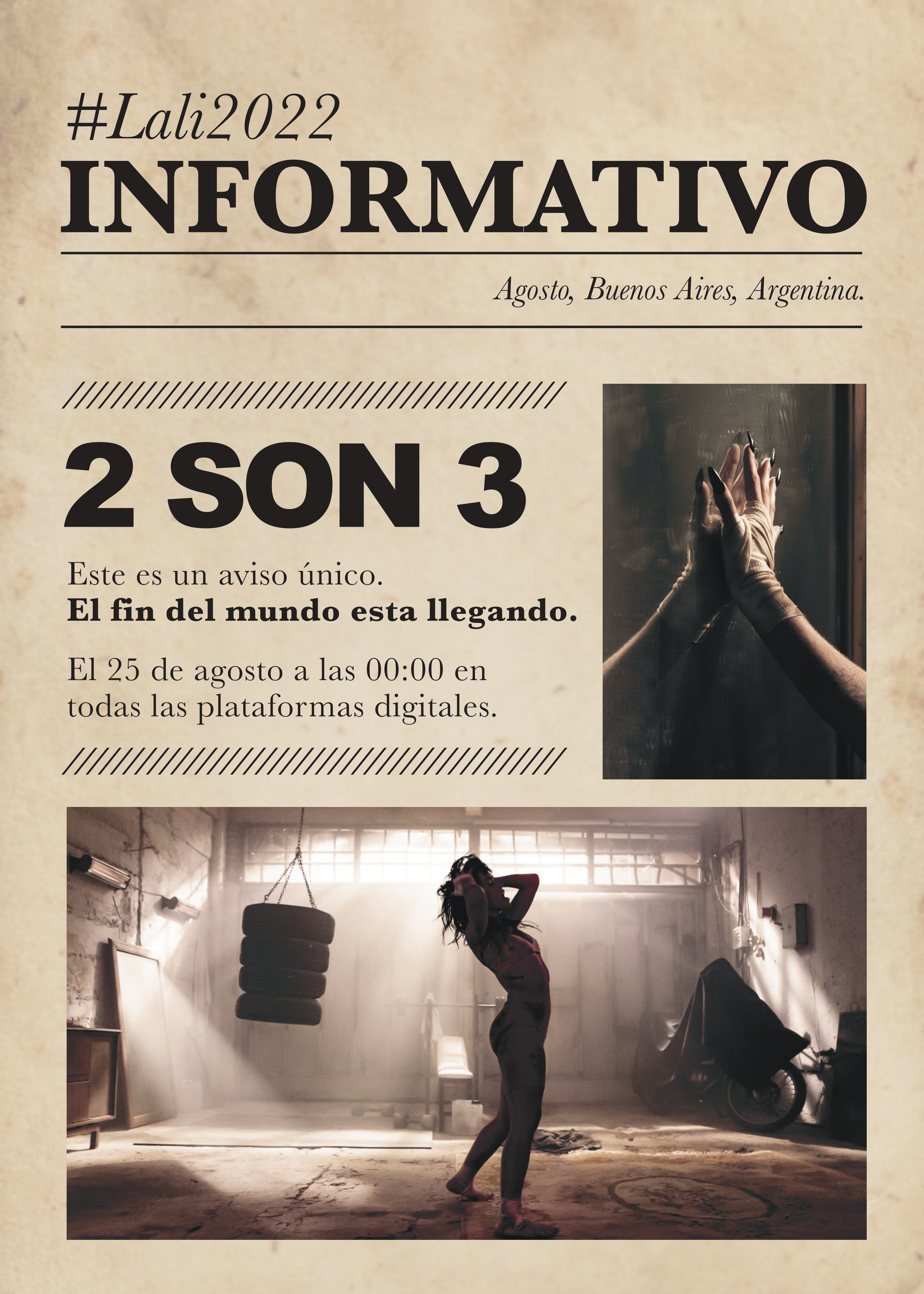 "Este es un aviso único. El fin del mundo está llegando", anunció Lali en un misterioso comunicado que anticipa el que será su próximo tema: "2 son 3", un single que saldrá a la luz en todas las plataformas digitales el 25 de agosto a las 00.00 horas.
