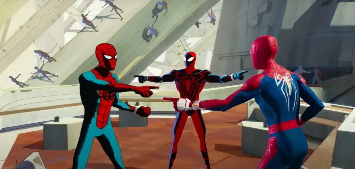 El trailer comienza con un breve vistazo a tres Spider-Man que no se corresponden con el estilo animado del film, más bien son representados en versión realista. Esto podría ser una clara referencia a los personajes que interpretan los actores Tobey Maguire, Andrew Garfield y Tom Holland y que aparecieron en la tercera película del héroe arácnido para el MCU (Universo Cinematográfico de Marvel por sus siglas en inglés y como se conoce al conjunto de películas y series interconectadas).