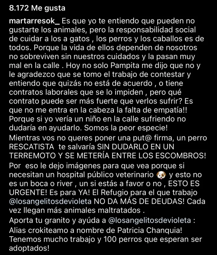 La influencer realizó un descargo contra la conductora y dijo: "Es que yo te entiendo que pueden no gustarte los animales, pero la responsabilidad social de cuidar a los gatos, los perros y los caballos es de todos. Porque la vida de ellos dependen de nosotros. No sobreviven sin nuestros cuidados y la pasan muy mal en la calle", comenzó diciendo en un escrito.