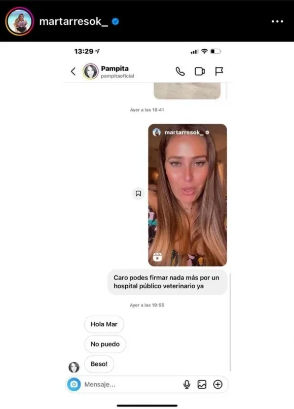 No obstante la respuesta de Carolina Ardohaim no tardó en llegar y la señaló de "busca fama" generando un ida y vuelta entre ambas que dejaron en claro su postura. El conflicto comenzó luego de que Tarrés le preguntara: "¿Caro podés firmar nada más por un hospital público veterinario ya?" y que la modelo respondiera: "Hola Mar no puedo, beso".