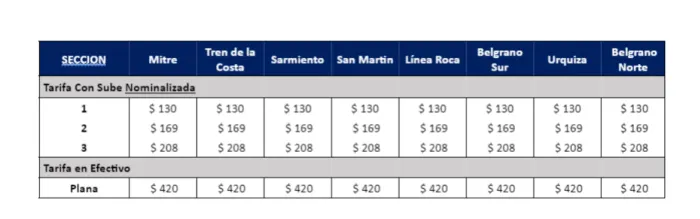 Para los trenes Mitre, Sarmiento, San Martín, Línea Roca, Belgrano Sur, Urquiza y Belgrano Norte, los precios finales serían los siguientes: