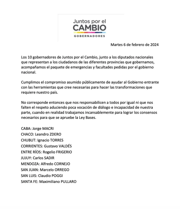 El comunicado de los mandatarios de la oposición catalogada "dialoguista" fue firmado por: Jorge Macri (CABA), Leandro Zdero (Chaco), Ignacio Torres (Chubut), Gustavo Valdés (Corrientes), Rogelio Frigerio (Entre Ríos), Carlos Sadir (Jujuy), Alfredo Cornejo (Mendoza), Marcelo Orrego (San Juan), Claudio Poggi (San Luis) y Maximiliano Pullaro (Santa Fe).