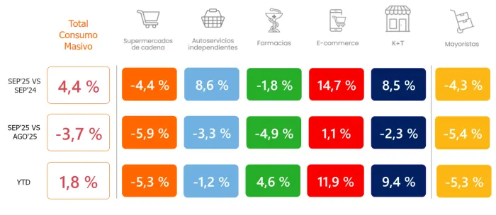 En el acumulado de los primeros nueve meses de 2025, el consumo masivo registró un aumento del 1,8% en comparación con el mismo período del año anterior. Este crecimiento fue impulsado principalmente por el e-commerce (+11,9%) y los mayoristas (+9,4%), mientras que los supermercados y mayoristas tradicionales mostraron caídas interanuales del 4,4% y 4,3%, respectivamente.