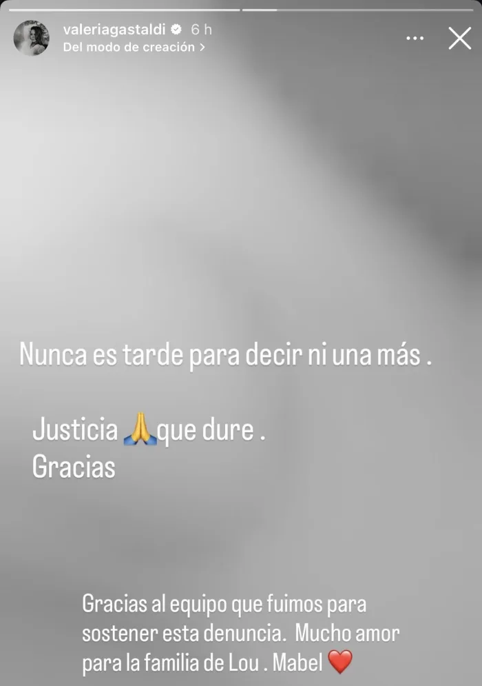 Luego fue el turno de Valeria quien posteo: "Nunca es tarde para decir ni una más" junto a un emoji de rezo pidió Justicia y escribió: "Que dure". Por último señaló: "Gracias al equipo que fuimos para sostener esta denuncia. Mucho amor para la familia de Lou", cerró.