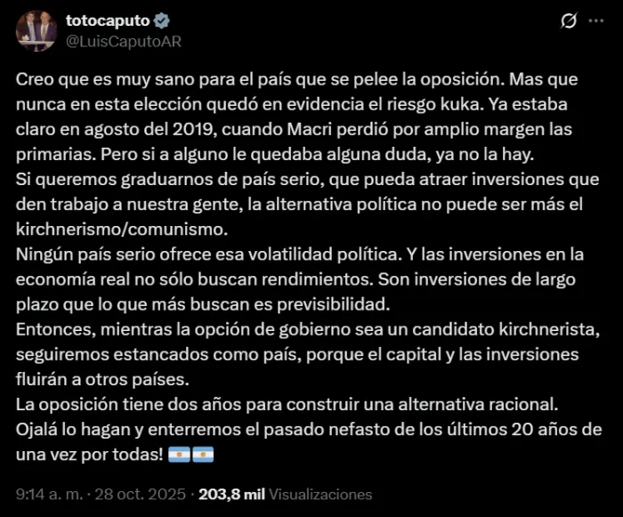 A través de un posteo que realizó en X, Caputo dijo que "si queremos graduarnos de país serio, que pueda atraer inversiones que den trabajo a nuestra gente, la alternativa política no puede ser más el kirchnerismo/comunismo". "Ningún país serio ofrece esa volatilidad política. Y las inversiones en la economía real no sólo buscan rendimientos. Son inversiones de largo plazo que lo que más buscan es previsibilidad", continuó.
