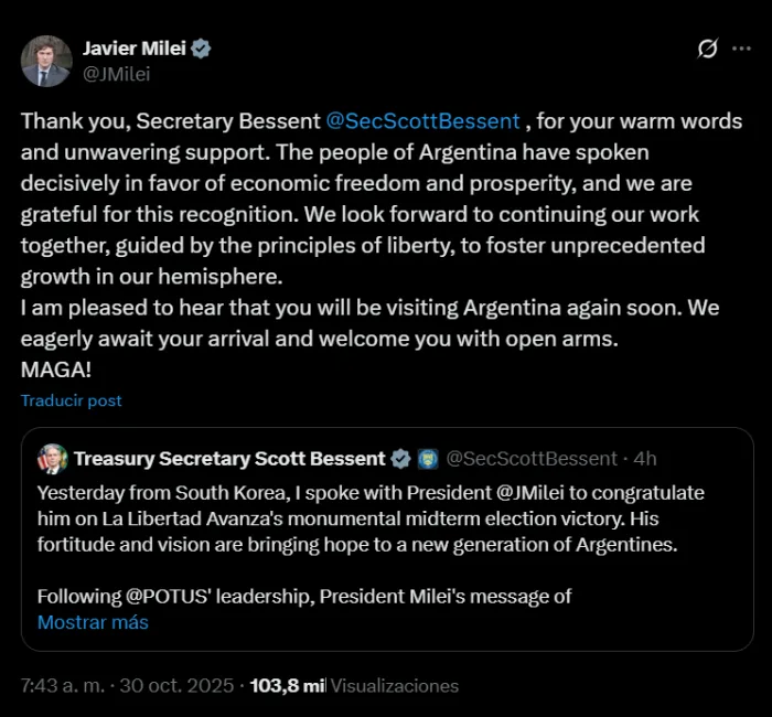 En respuesta al posteo de Bessent, el presidente Javier Milei agradeció las "amables palabras y el apoyo incondicional" del secretario del Tesoro. Resaltó que el pueblo argentino "se manifestó con contundencia a favor de la libertad económica y la prosperidad, y agradecemos este reconocimiento".