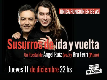 ANGEL RUIZ luego de haber protagonizado un gran éxito con el musical “Miguel de Molina al desnudo”, regresa a la Argentina para presentar y por sólo una única función su nuevo espectáculo SUSURROS DE IDA Y VUELTA acompañado por el maestro Bru Ferri, el próximo 11 de Diciembre de 2025 a las 22 hs en el Teatro Picadero (Pje Enrique S. Discépolo 1857) de la Ciudad Autónoma de Bs As.