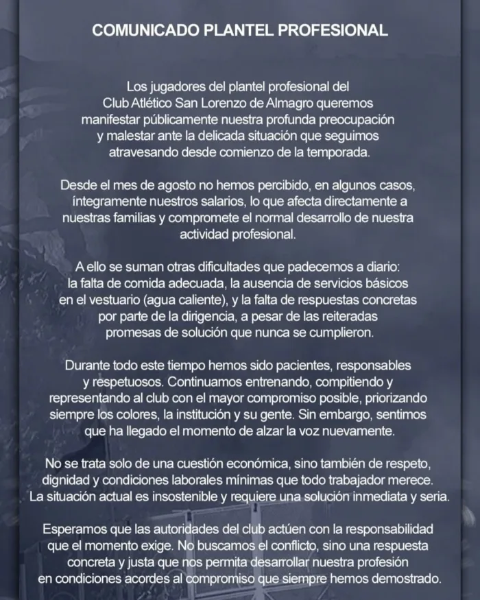 “Desde el mes de agosto no hemos percibido, en algunos casos, íntegramente nuestros salarios, lo que afecta directamente a nuestras familias y compromete el normal desarrollo de nuestra actividad profesional”, expresaron en primera instancia los futbolistas del Ciclón.