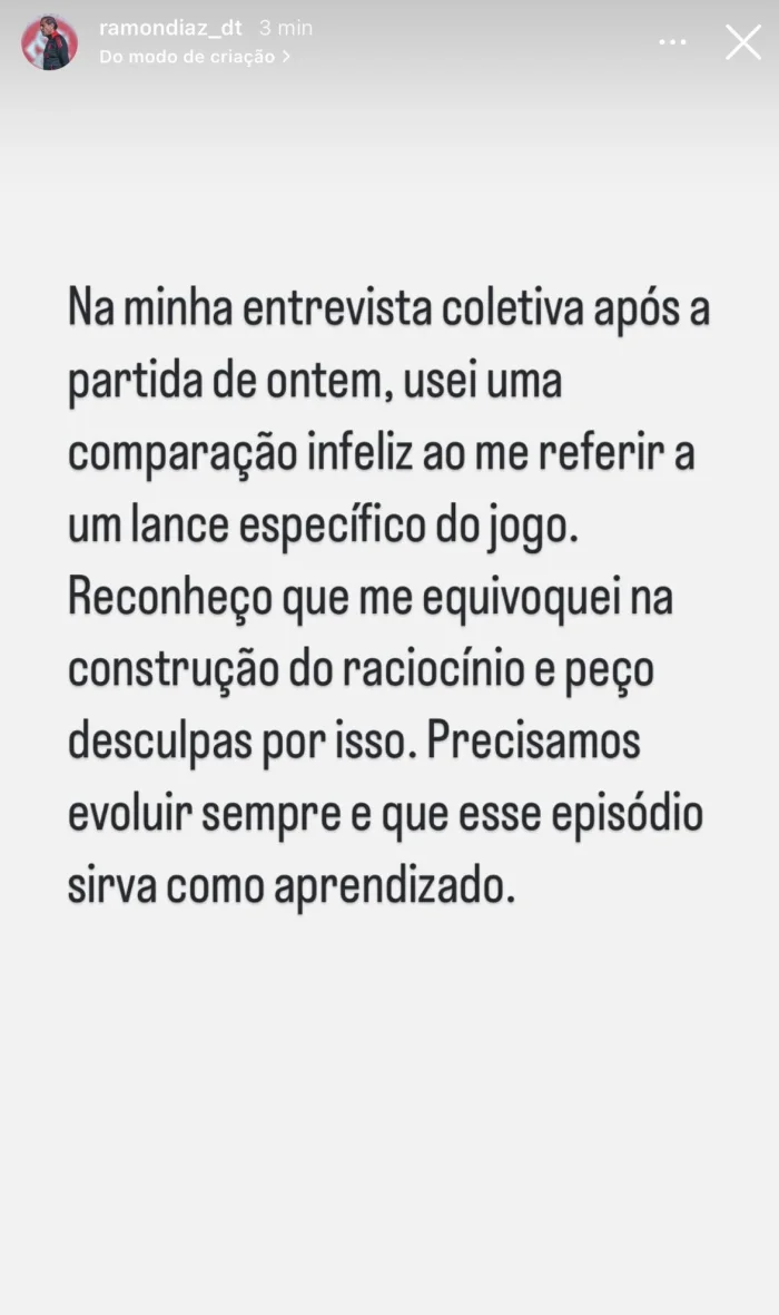 La expresión del técnico causó revuelo y los dirigentes de Inter tomaron cartas en el asunto. Según el periodista Alexandre Ernest, le pidieron al DT que se retracte, lo que finalmente terminó haciendo a través de un mensaje en una historia de Instagram, que se borró después de 24 horas. "En mi rueda de prensa posterior al partido de ayer, hice una desafortunada comparación al referirme a una jugada específica. Reconozco que me equivoqué en mi razonamiento y pido disculpas. Siempre debemos mejorar, y espero que este episodio nos sirva de aprendizaje", escribió.