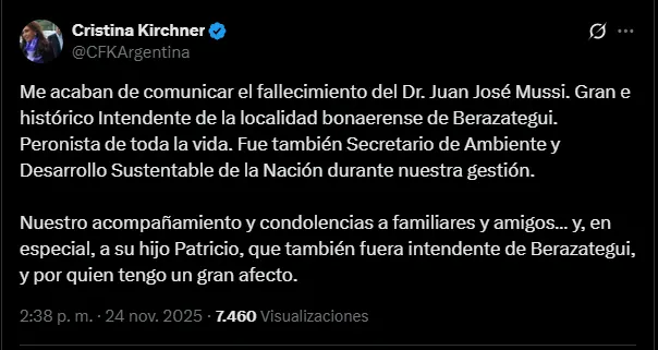 "Me acaban de comunicar el fallecimiento del Dr. Juan José Mussi. Gran e histórico Intendente de la localidad bonaerense de Berazategui. Peronista de toda la vida. Fue también Secretario de Ambiente y Desarrollo Sustentable de la Nación durante nuestra gestión. Nuestro acompañamiento y condolencias a familiares y amigos… y, en especial, a su hijo Patricio, que también fuera intendente de Berazategui, y por quien tengo un gran afecto", escribió la ex presidenta.