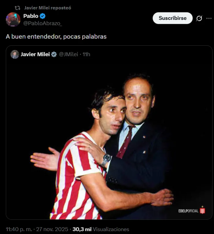 Tras conocerse el fallo, el mandatario publicó en redes una imagen de Carlos Salvador Bilardo junto a Osvaldo Zubeldía, dos glorias de Estudiantes de La Plata. Luego, reposteó la publicación de un usuario que citó el posteo original y escribió: "A buen entendedor, pocas palabras".