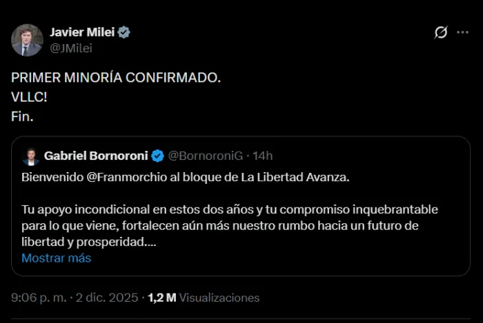 "PRIMERA MINORÍA CONFIRMADO", celebró el presidente Javier Milei. En la Casa Rosada festejan: es que la nueva posición dentro del esquema parlamentario, reviste al oficialismo de mayor músculo de cara a la discusión por el Presupuesto y la reforma laboral, ejes centrales de la inminente convocatoria a sesiones extraordinarias.