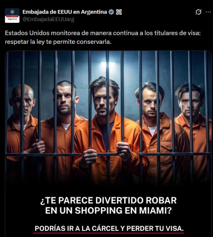 En la imagen que publicó la sede diplomática de EEUU en Argentina, se ve tras las rejas a cinco hombres vestidos con el clásico traje naranja que usan los detenidos en Estados Unidos. Al pie de la imagen, una advertencia que dice: "¿Te parece divertido robar en un shopping en Miami? Podrías ir a la cárcel y perder tu visa". "Estados Unidos monitorea de manera continua a los titulares de visa: respetar la ley te permite conservarla", agrega la publicación.