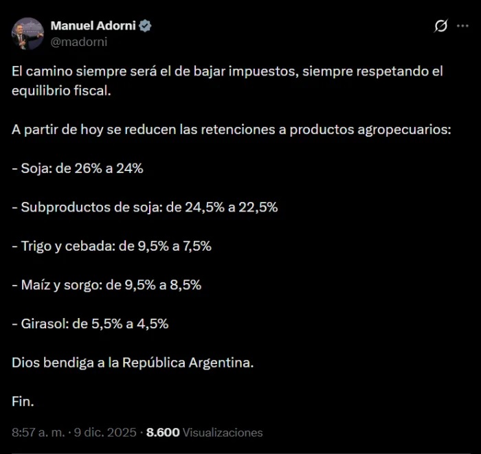 El titular del equipo económico añadió que eliminar las retenciones "ha sido siempre una prioridad para el presidente Javier Milei". "Y seguiremos haciendo todo lo posible para alcanzar este objetivo lo antes posible -continuó-. Ya hemos dado muchos avances concretos en esta dirección y seguiremos haciéndolo, en la medida que las condiciones macroeconómicas así lo permitan".