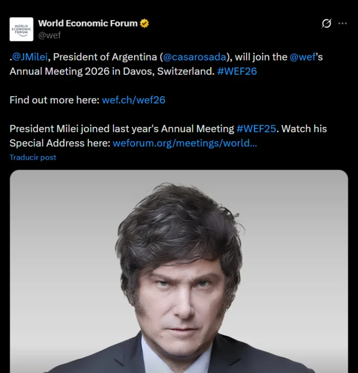 "El presidente Javier Milei participará en la reunión anual 2026 del Foro Económico Mundial en Davos", informaron.