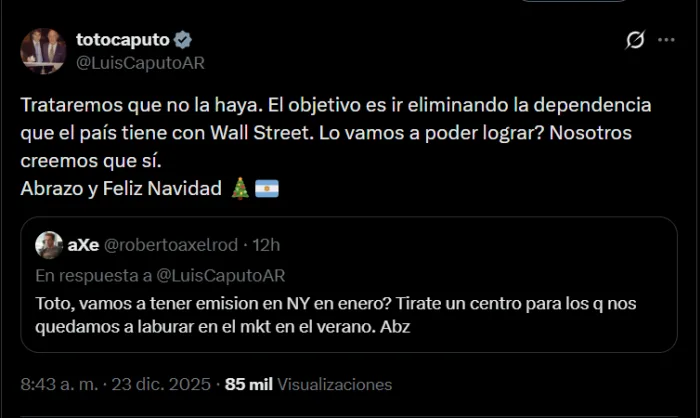 "El objetivo es ir eliminando la dependencia que el país tiene con Wall Street. ¿Lo vamos a poder lograr? Nosotros creemos que sí", dijo el titular del Palacio de Hacienda. Fue en respuesta a un usario que lo consultó acerca de las alternativas que maneja el Gobierno para afrontar los próximos vencimientos de deuda.