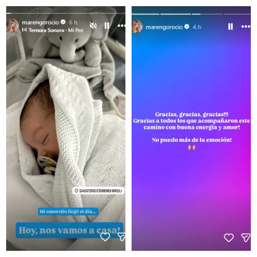 Con una serie de stories, Marengo comunicó la noticia y agradeció a todos los que le brindaron amor durante estos días. "Llegó el día, ¡Hoy nos vamos a casa!", posteó Rocío junto a una foto del bebé.