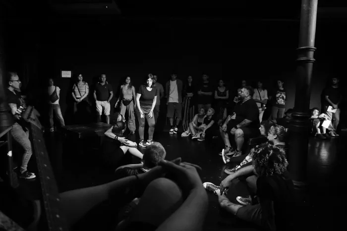 Entramos a una sala sin escenario, nos sentamos o paramos distribuidos desordenadamente frente a una banda en vivo que acompaña a un grupo de actores que parece contar varias historias a la vez: algunos corren, otros leen un escrito, dos se abrazan encontrándose y una de ellas busca desesperadamente a su hija.