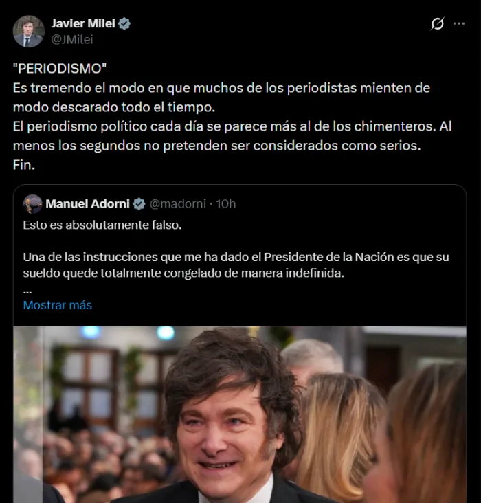 Pocos minutos después, Milei citó el posteo y comentó: "Es tremendo el modo en que muchos de los periodistas mienten de modo descarado todo el tiempo. El periodismo político cada día se parece más al de los chimenteros. Al menos los segundos no pretenden ser considerados como serios".