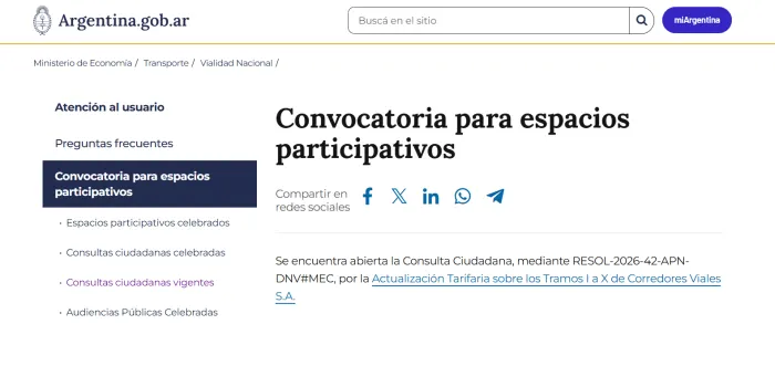 La Dirección Nacional de Vialidad (DNV) inició un llamado de consulta pública para implementar un aumento del 19% en los peajes de las rutas nacionales actualmente concesionadas a Corredores Viales S.A., ante un contexto marcado por el proceso de privatización del sistema vial.