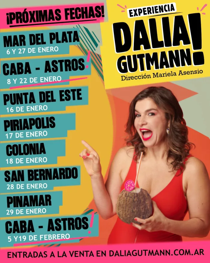 “Experiencia Dalia Gutmann” es un show unipersonal donde a través de su humor catártico y emocional, Dalia comparte esas experiencias que le arruinan la vida pero que intenta convertir en comedia.