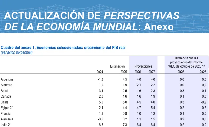 Las cifras son idénticas a las proyecciones de octubre pasado y están por encima del valor estimado para la región de América Latina y el Caribe, la cual, siempre según las estimaciones del Fondo, experimentará un crecimiento del 2,2% este año y 2,7% en 2027. La tasa estimada también supera a las proyecciones para otros actores de la región, como Brasil y México.