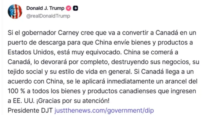 Donald Trump arremetió este sábado contra el primer ministro canadiense Mark Carney, amenazando con imponer un arancel del 100 % a todos los bienes canadienses si Ottawa concreta un acuerdo comercial con China, según publicaciones del presidente en su red social.