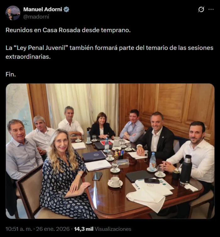 La ampliación de la agenda legislativa de febrero se resolvió esta mañana durante una reunión de la mesa política de La Libertad Avanza para analizar la marcha de las negociaciones por la reforma laboral y la estrategia del oficialismo. "Reunidos en Casa Rosada desde temprano", escribió el jefe de Gabinete Manuel Adorni al pie de una foto del encuentro que compartió este mediodía en X. "La 'Ley Penal Juvenil' también formará parte del temario de las sesiones extraordinarias", informó el ministro coordinador.